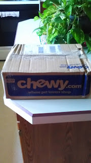 WE love Mr. Chewy, mom orders in on her magic computer and in just two days there is a box waiting just for US outside. That Mr. Chewy is one fast driver.