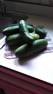 This is Mom's cucumber plant growing out of a pot at the end of the deck. Here are the cucumbers she has got off of it so far. WE have no rude comment to make. Sigh..........